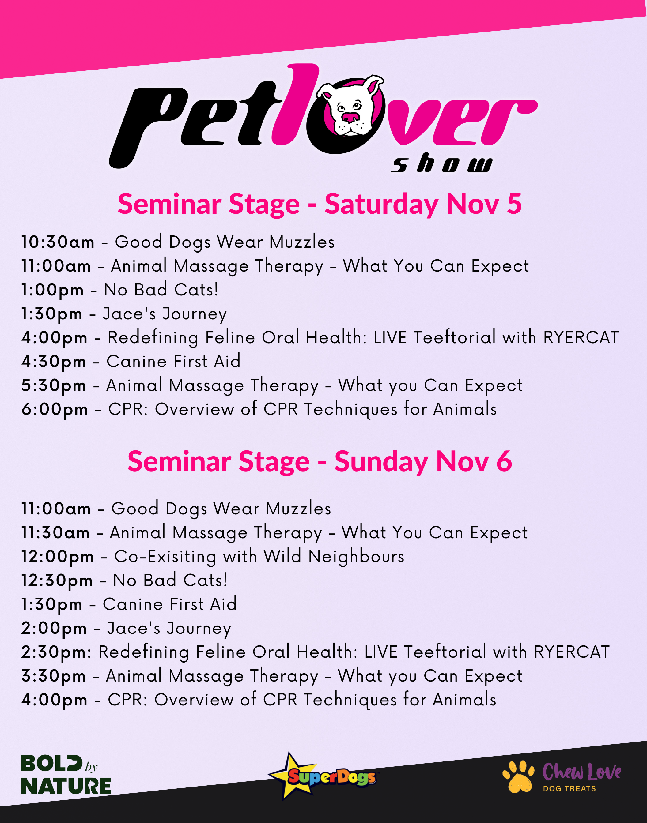 This area will be located just off the show floor. The entrance will be just between the Nutram and Pet Pantry booths. Please note, though we love your pups, this will be a dog free area to maintain harmony at the show.